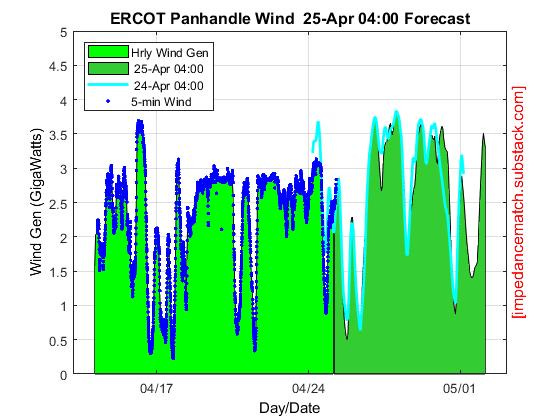 Notice the general plateau of Actual delivered wind just under 3 GW (although there are exceptions like on 4/16). Coming up, it looks like > 3 GW is in the forecast. We expect some of this to be stranded supply.