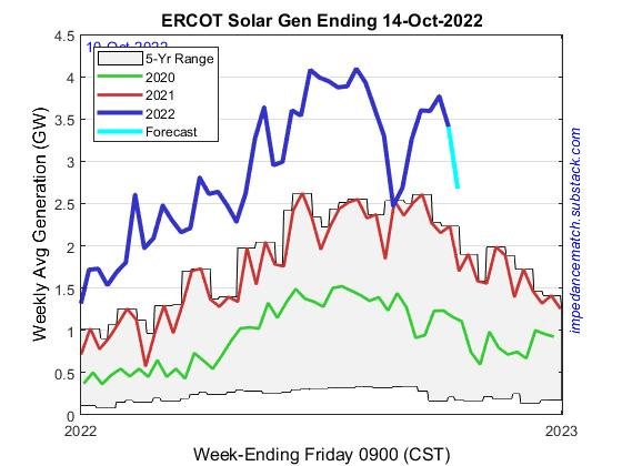 Wind is projected higher this week at 7.70 GW versus 5.82 GW last week and 8.34 GW the week before. This week’s wind forecast is in the lower portion of the 5-year band indicating below normal wind production. Wind appears to be serving most of the increased load this year.